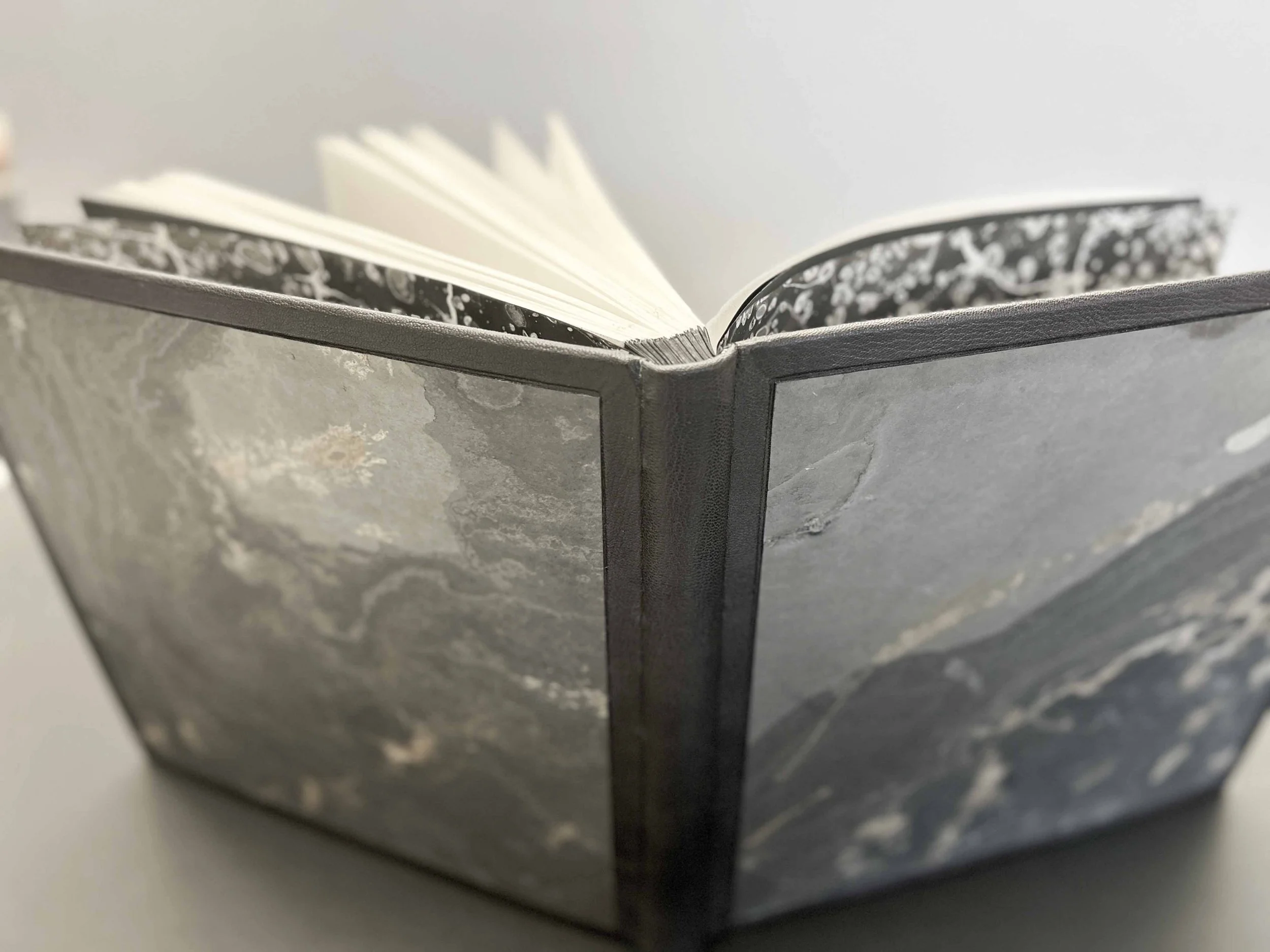 Book bound with stubs binding. Black goatskin leather with stone veneer inserts